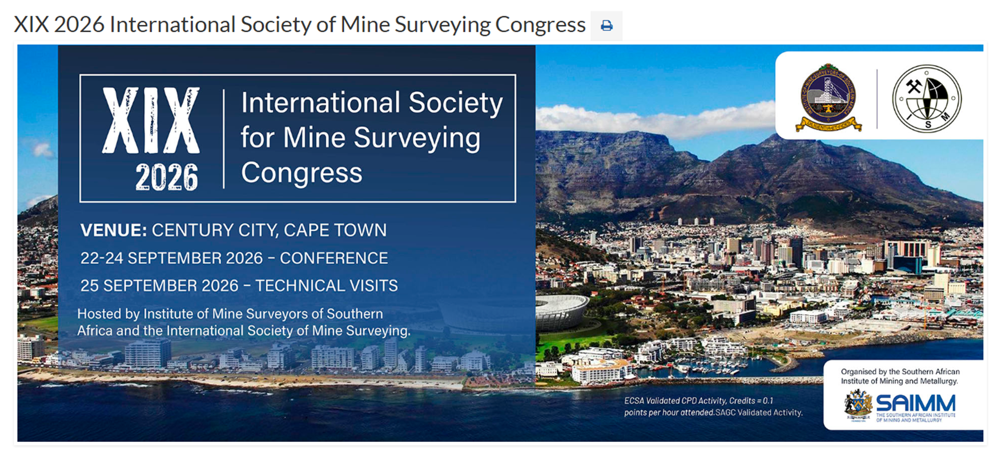 According to the decision of the 50th Presidium Meeting, the XIX International Congress for Mine Surveying will be held in Cape Town, South Africa in 22-25 September 2026. The main organizer is the Institude of Mine Surveyors of Southern Africa.